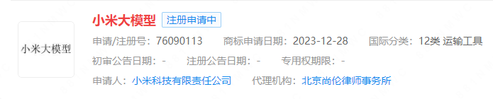 据企查查发布的消息,手机制造商小米近日申请注册科学仪器类“ChatMI”商标、运输工具类“小米大模型”商标,当前商标状态均为等待实质审查。